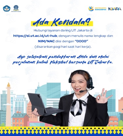 Jangan biarkan proses pendaftaran Anda terhenti di admisi. Segera lengkapi berkas dan ikuti seluruh tahapan pendaftaran agar Anda dapat melanjutkan perjalanan akademik sebagai mahasiswa Universitas Terbuka.  Apabila mengalami kendala selama proses pendaftaran, calon mahasiswa dapat menghubungi Layanan Daring UT Jakarta melalui  https://sl.ut.ac.id/ut-hub (dengan mengisi nama lengkap dan NIM/NAC diisi “0000”, disarankan menghubungi pada hari dan jam kerja).